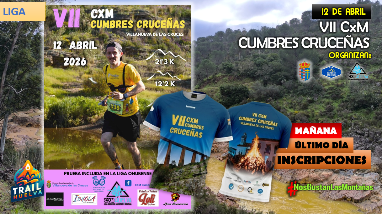 😎 Seguimos, con la siguiente prueba de la Liga Onubense de CxM con la VII CxM CUMBRES CRUCEÑAS, que se celebrará 12 de Abril, a partir de las 10:00h, en Villanueva de las Cruces (Huelva).
